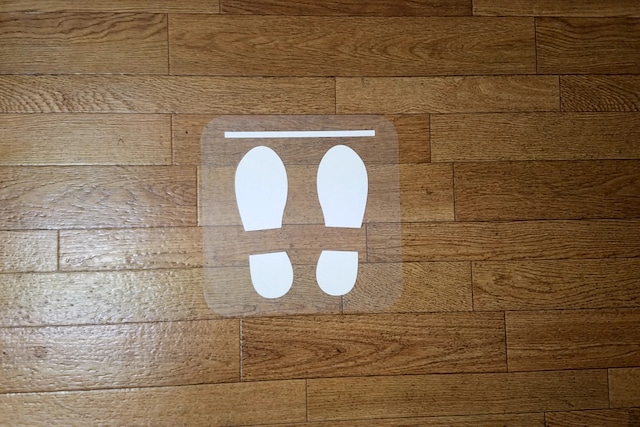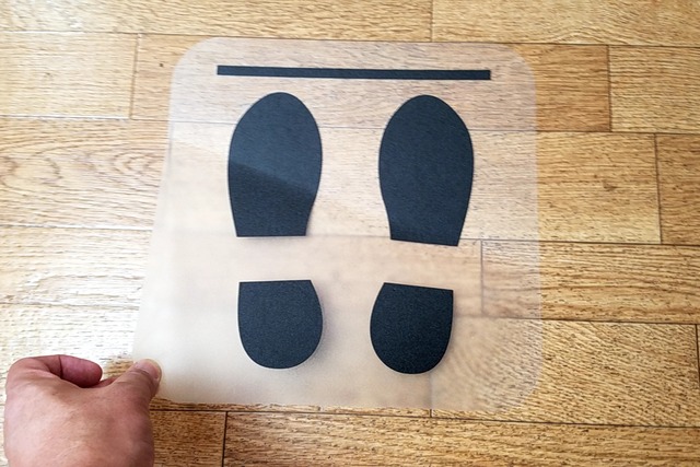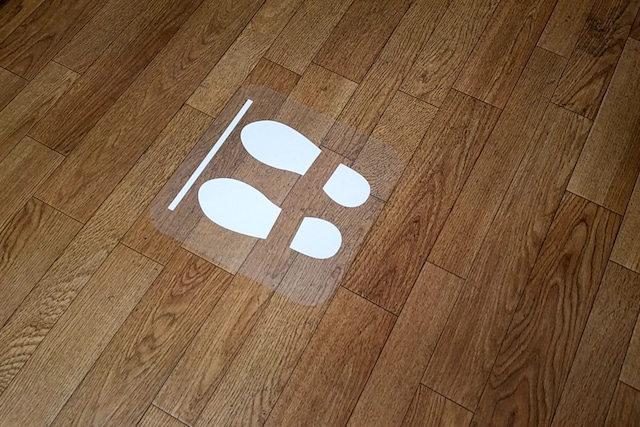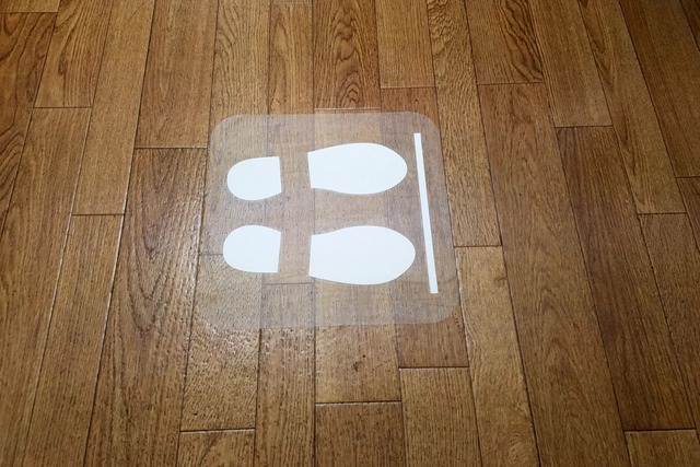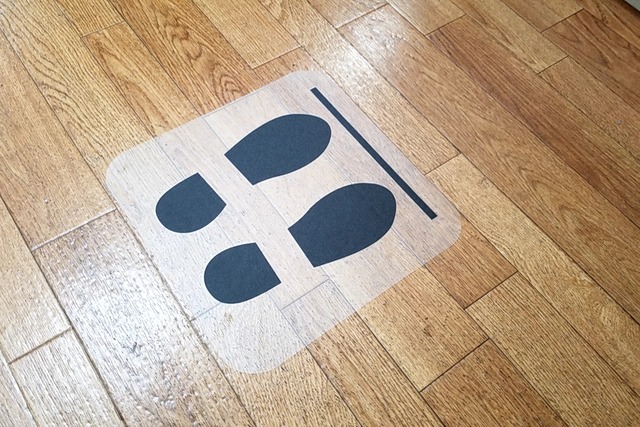 ソーシャルディスタンスにつき、お客様がレジなどに並んで頂く際の立ち位置を記した「足型マーク」シールです。