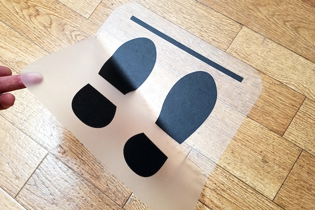 貼りたい足型の位置にある、現状の床(Pタイルやフローリング、クッションフロアなど)をキレイに拭いてから、空気が入らないように貼ってください。