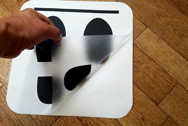 マーク以外の部分は、床の柄が見えるように半透明(床用ラミネート仕上げ)にして、1枚物で製作しましたので、どなたでも貼り易くなっております。